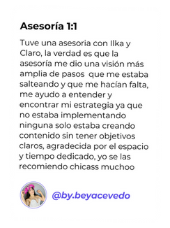 - 90 minutos de asesoria personalizada: Sesion en linea donde abordamos exactamente lo que necesitas mejorar.